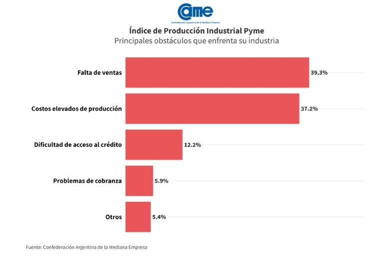 Las empresas manifiestan estar produciendo en un entorno donde la demanda insuficiente, los altos costos y las dificultades financieras se combinan para crear un escenario complicado. Los principales obstáculos que enfrentan en estos momentos tuvieron como protagonista con el 39,3% a la falta de ventas, mientras que el 37,2% se refirió a los altos costos de producción y logísticos, el 12,2% a la falta de acceso al financiamiento y otro 5,9% a los problemas de cobranza.