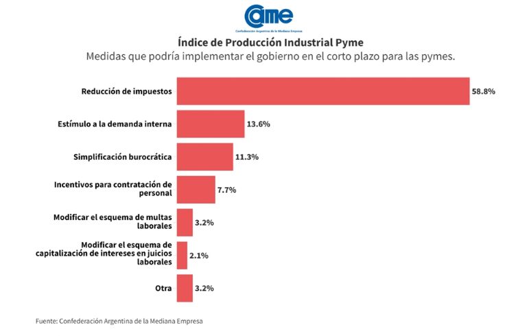 Para las empresas la reducción de la carga fiscal es la medida de apoyo más urgente requerida, con 58,8% de las respuestas, marcando la necesidad de disminuir impuestos nacionales, provinciales y tasas municipales. Las empresas consideran que una reducción impositiva podría liberar recursos financieros para mantener operaciones, invertir en crecimiento y mejorar la competitividad.