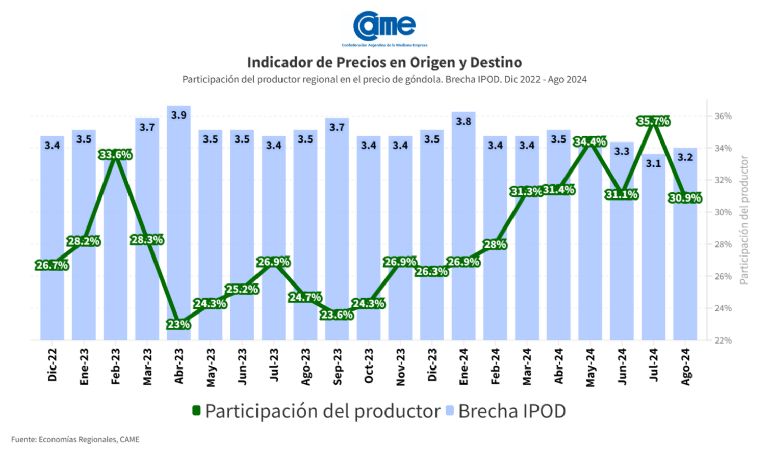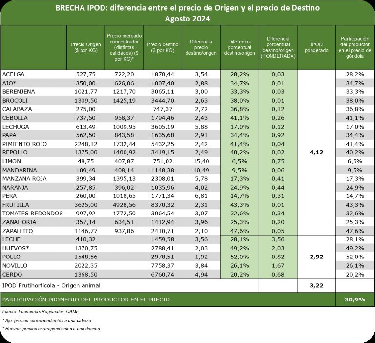 Los precios de los agroalimentos se multiplicaron por 3,2 veces del campo (origen) a la góndola (destino) en agosto. Es decir, el consumidor pagó $3,2 por cada $1 que recibió el productor, según el Indicador de Precios en Origen y Destino (IPOD) elaborado por el sector de Economías Regionales de la Confederación Argentina de la Mediana Empresa (CAME).
