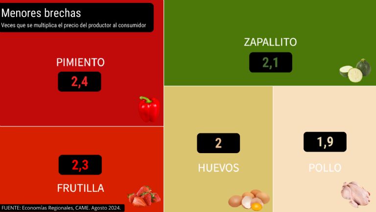 Con 1,9 veces, el pollo fue el producto con menor brecha en el mes de agosto, aumentando sus precios en origen (18,5%) y disminuyendo 0,6% en destino. Los huevos (2), por su parte, aumentaron un 5,4% en góndola, pero bajaron 1% al productor. Cabe mencionar que ambos productos se están produciendo con variaciones en los costos estructurales, ya que la materia prima de los alimentos balanceados está con baja de precios.