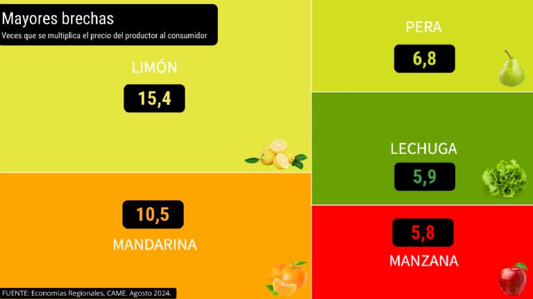 El limón (15,4 veces), la mandarina (10,5), la pera (6,8), la lechuga (5,9) y la manzana roja (5,8), fueron los cinco productos que presentaron mayor diferencia entre los precios de origen y destino.