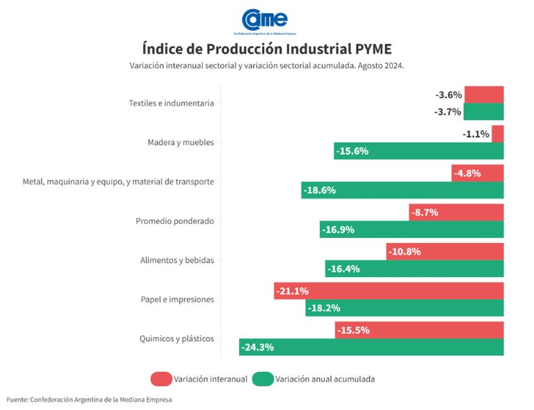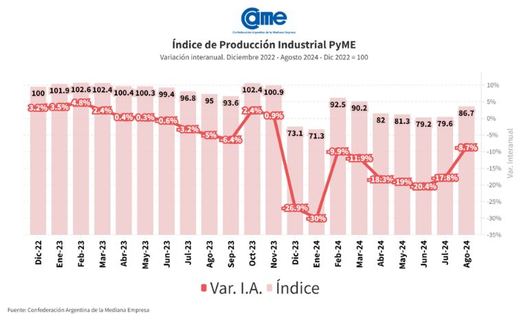 La actividad manufacturera de las pymes descendió 8,7% interanual en agosto y acumula una retracción de 16,9% en los primeros ocho meses del año frente al mismo periodo de 2023. Las industrias pymes aún no muestran señales firmes como para afirmar la existencia de un cambio de tendencia o de reactivación, más que algunos focos los cuales van siendo aleatorios mes a mes.