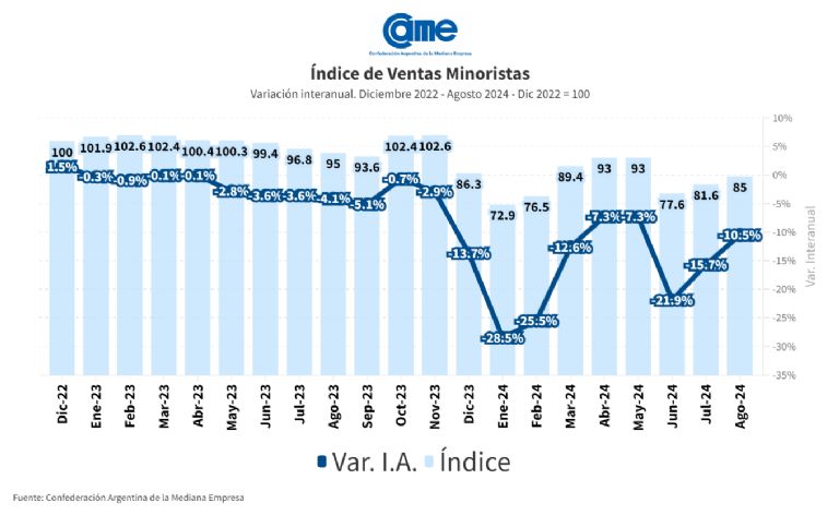 Así surge del Índice de Ventas Minoristas Pymes de la Confederación Argentina de la en Mediana Empresa (CAME), elaborado en base a un relevamiento mensual entre 1.300 comercios minoristas del país, realizado del 2 y 6 de agosto.