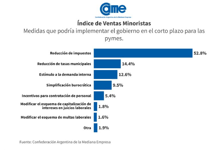 En el caso de los impuestos nacionales, concentró 29,3% de las respuestas. La reducción de impuestos provinciales se llevó el 23,5%, y 14,4% apuntó a la reducción de tasas municipales. Saliendo de ese tópico, sobresalió el reclamo de medidas que fortalezcan la demanda interna (12,6% de las respuestas) y que generen incentivos para la contratación de personal (5,4%).