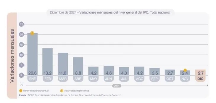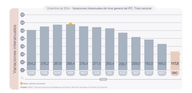Y añadió: "La variación interanual del IPC Nacional fue de 117,8% i.a., siendo el octavo mes consecutivo de desaceleración en la comparación contra igual mes del año anterior, y contrastando con el 211,4% de inflación registrado en 2023. Cabe destacar que la inflación anunciada hoy fue la menor para un mes de diciembre desde 2018".
