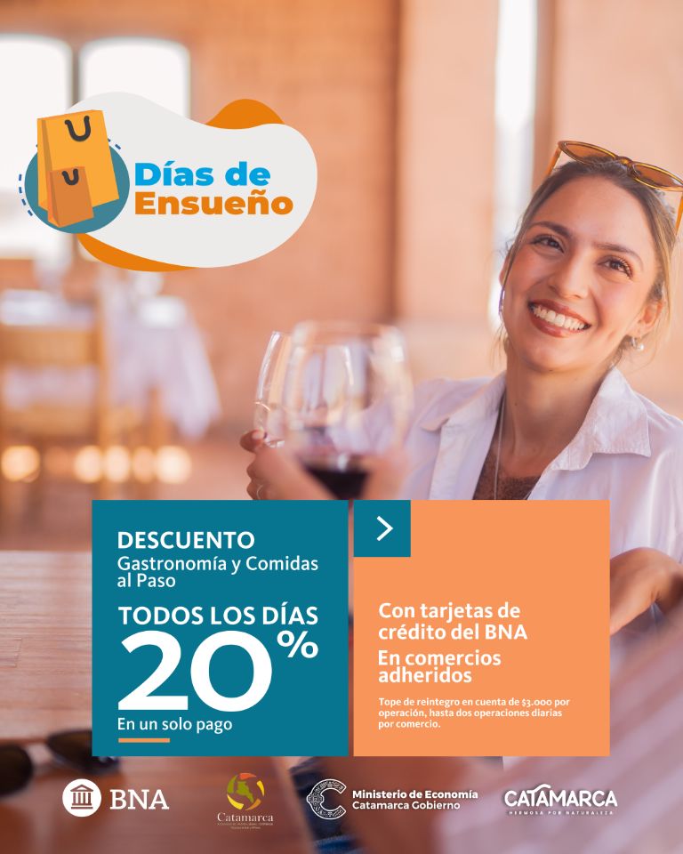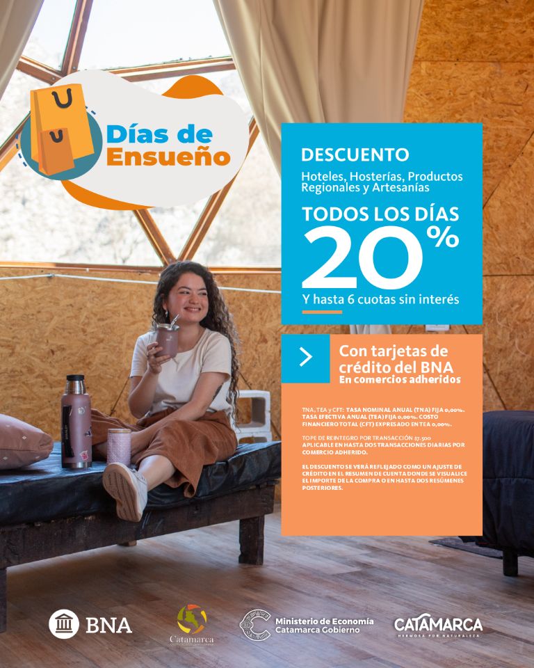 Sigue vigente la campaña Días de Ensueño Turismo que impulsan el Gobierno de Catamarca, el Banco de la Nación Argentina y la Unión Comercial de Catamarca con descuentos del 20% en comercios locales de los rubros Gastronomía, Comidas al Paso, Hoteles, Hosterías y Productos Regionales.
