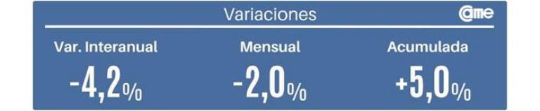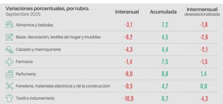 Por rubros, los más afectados fueron Textil e indumentaria (-10,9%) y Bazar, decoración, textiles para el hogar y muebles (-6,2%). En la comparación mensual, solo Perfumería mostró un crecimiento del 1,4%, mientras que Ferretería y materiales de construcción se mantuvieron estables.