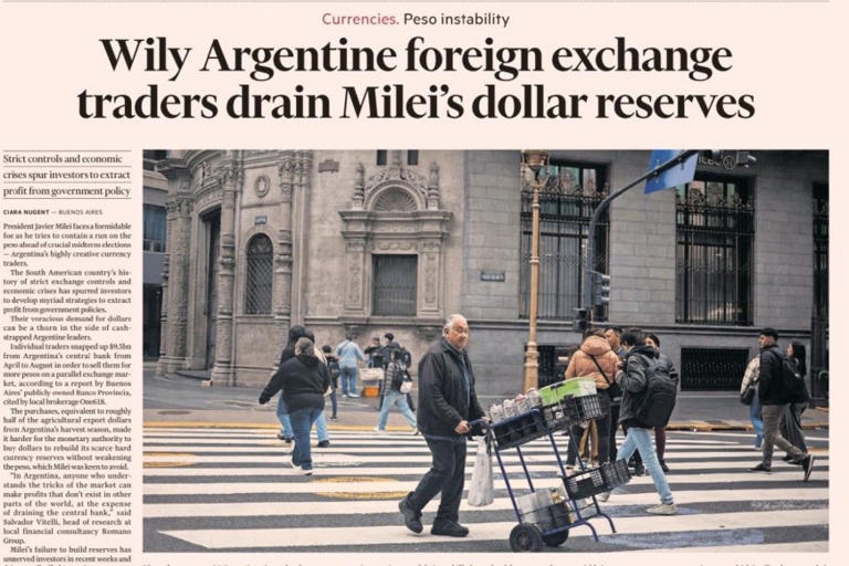 “El fracaso de Milei en acumular reservas ha inquietado a los inversores en las últimas semanas e impulsado una liquidación de activos argentinos”.