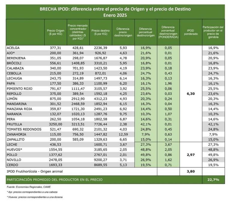 La brecha en los productos frutihortícolas y en los de origen animal