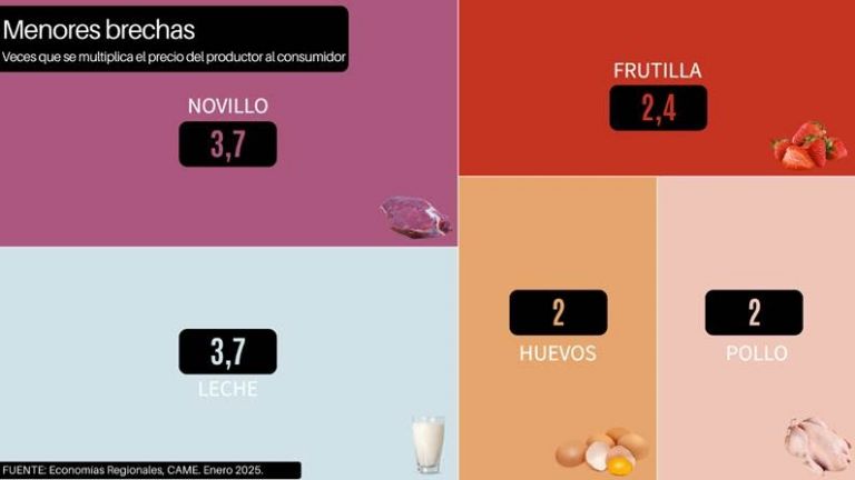 Por último, la leche y el novillo presentaron una brecha de 3,7 veces, pero sus precios no se comportaron de la misma manera. Mientras la leche bajó 1,5% al productor y aumento 6,9% al consumidor, el novillo aumentó 6,2% en origen y disminuyó un 4,9% en góndola.
