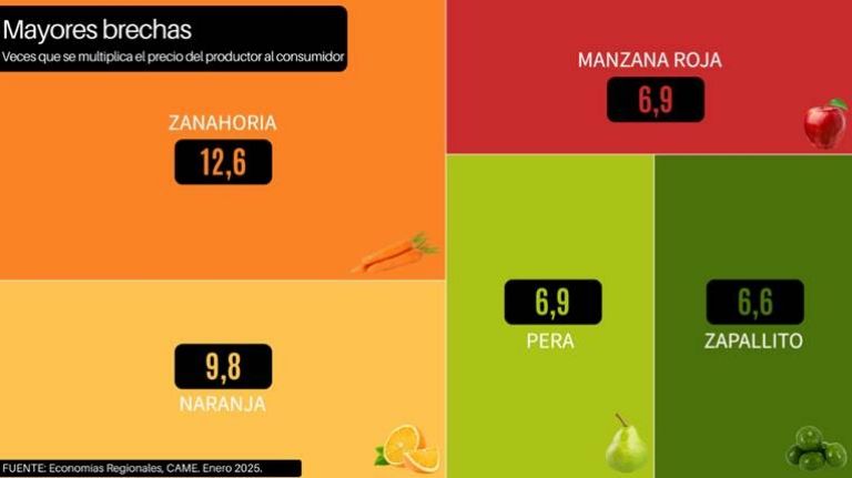 La zanahoria (12,6 veces), la naranja (9,8), la manzana roja (6,9), la pera (6,9) y el zapallito (6,6 veces) fueron los cinco productos que presentaron mayor diferencia entre los precios de origen y destino.