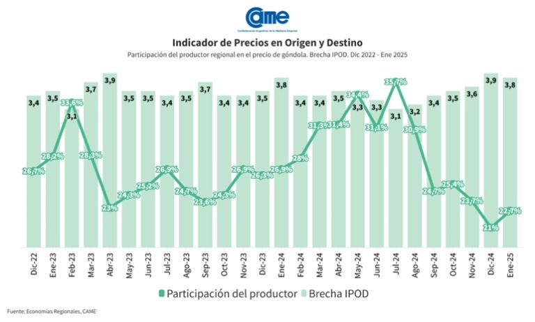 - IPOD de origen animal: por los cinco productos y subproductos de origen animal que componen la canasta IPOD, el consumidor abonó tres veces más de lo que recibió el productor, un 3,4% más que en diciembre 2024.