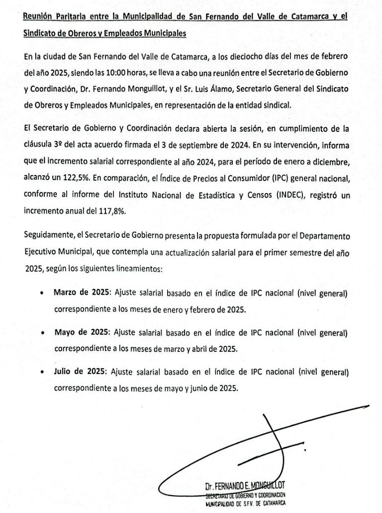 Según el ofrecimiento, la Municipalidad propuso un aumento de haberes en el mes de marzo, teniendo en cuenta los índices inflacionarios de enero y febrero; un nuevo incremento en mayo basado en la inflación de marzo y abril; y por último, una suba en julio basada en la inflación de mayo y junio.