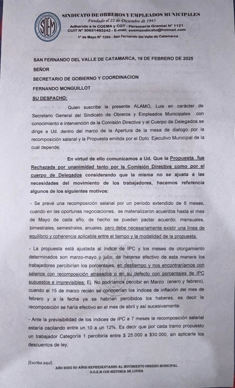 "El día de hoy se realizó el pedido formal de un 20% sobre todos los ítems que integran nuestro recibo de sueldo en un solo pago a partir del mes de febrero. Mas una actualización automática por inflación desde el mes de marzo hasta junio. Queremos recuperar medianamente el poder adquisitivo de nuestros salarios para poder brindar y cubrir necesidades básicas de nuestras familias", expresa un comunicado difundido por el gremio, que finaliza advirtiendo que "nos encontramos en asamblea permanente".