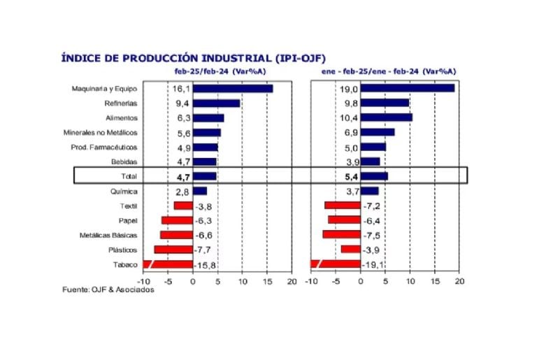 En segundo lugar, se encuentra el sector de las refinerías, que creció un 9,4% en febrero y acumuló un aumento de 9,8% en el primer bimestre, lo que refleja una recuperación en la producción de combustibles y derivados.