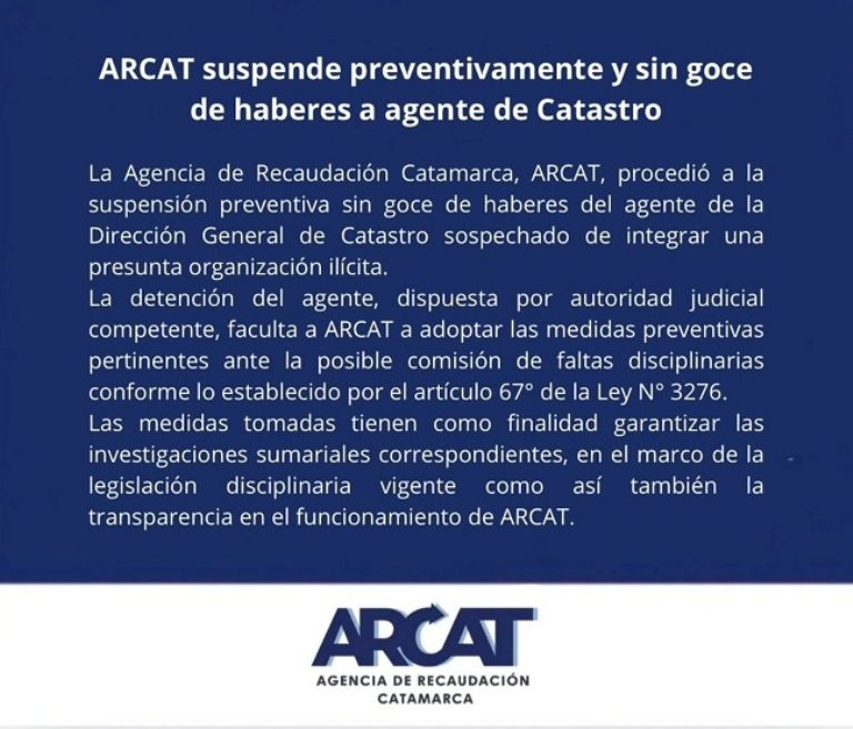 Se trata de una suspensión preventiva de un agente de la Dirección General de Catastro hasta tanto se determine su responsabilidad o no en el marco de la investigación por una asociación ilícita integrada por personas de varias áreas del Gobierno y de la Justicia.