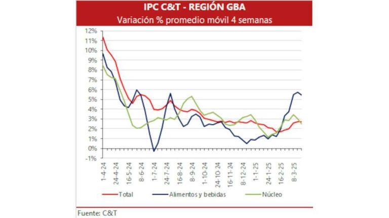 La consultora Econviews también reportó una suba del 3,9% en la canasta de alimentos y bebidas, con un aumento destacado de 2,2% en la cuarta semana de marzo. Las categorías que más contribuyeron a este incremento fueron carnes y derivados (1,5%), almacén (1,7%) y verdulería (2,5%).