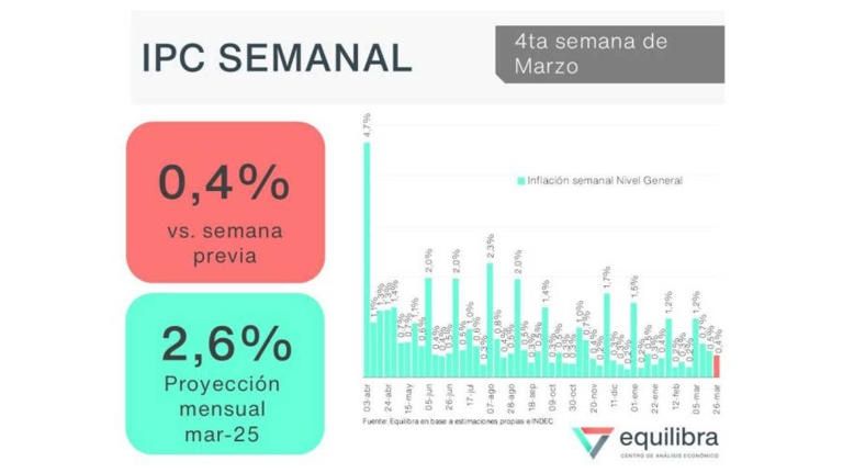 El Índice de Precios al Consumidor (IPC) oficial será dado a conocer el próximo 11 de abril por el INDEC, pero las predicciones privadas ya dejan entrever una ligera aceleración en el ritmo de la inflación. La consultora Equilibra, por ejemplo, calcula una suba de 2,6%, explicando que en la última semana de marzo los precios registraron un aumento de 0,4%, impulsado principalmente por los precios de productos estacionales como verduras e indumentaria. "No se observó un impacto significativo en precios por la incertidumbre cambiaria", puntualizó Equilibra en su informe, sugiriendo que la inflación se encamina hacia una leve aceleración respecto a febrero.
