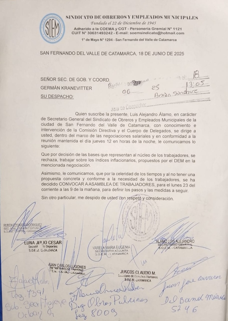 El gremio SOEM informó que el lunes 23 de junio se realizará una asamblea general de trabajadores con el propósito de decidir los pasos a seguir ante la falta de propuesta oficial de un incremento salarial.