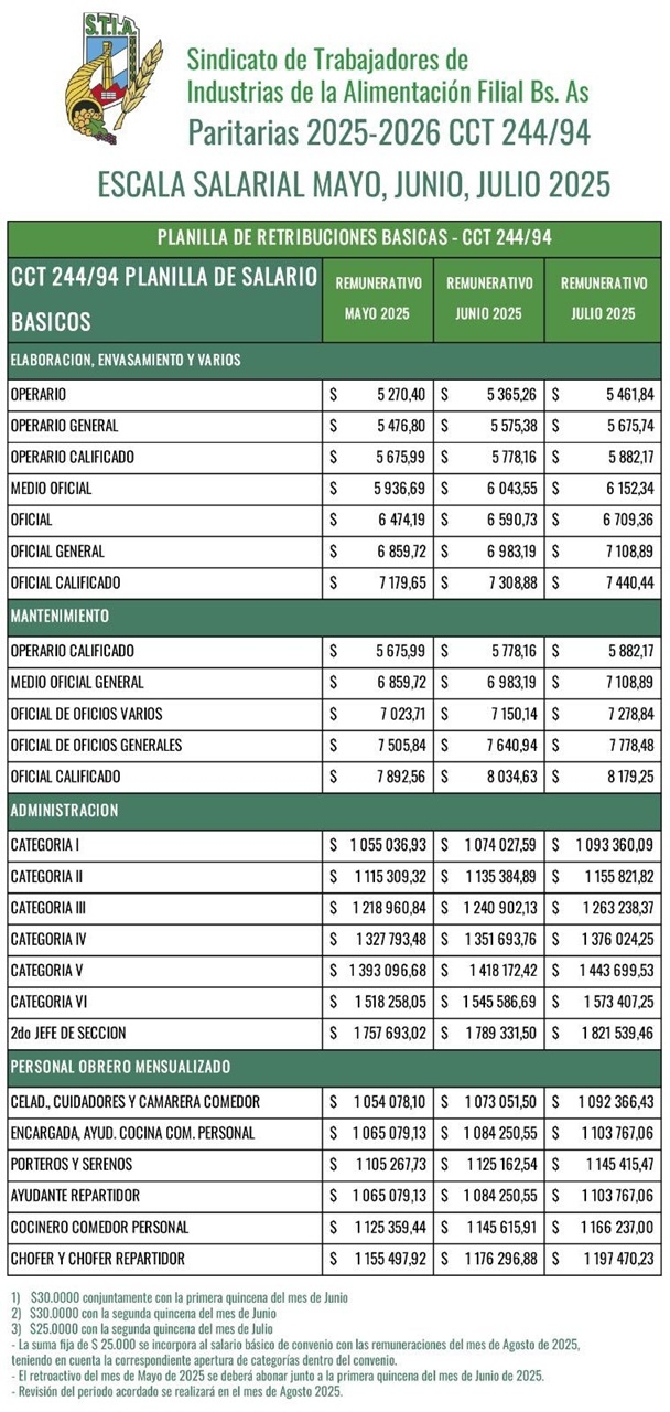 La paritaria firmada determinó las escalas salariales para mayo, junio y julio de 2025, junto con beneficios adicionales para los trabajadores del Convenio Colectivo de Trabajo 244/94.