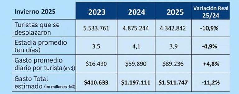 l Las vacaciones de invierno sintieron la caída en el poder adquisitivo familiar, la pérdida de competitividad cambiaria y un clima más frio y lluvioso de lo habitual. En ese contexto, viajaron 4,3 millones de personas por el país, 10,9% menos que el año pasado, y gastaron $ 1,5 billones en las ciudades que integran el circuito turístico nacional. El impacto económico fue un 11,2% menor a 2024, medido a precios constantes.