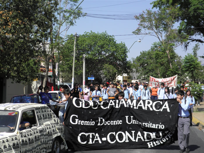 Gran participación de docentes, no docentes, gremialistas, alumnos, autoridades del establecimiento, padres, entre otros, marchan por las calles del micro centro donde se dirigen hacia el Rectorado para exclamar nuevamente el pedido que aún está en espera.