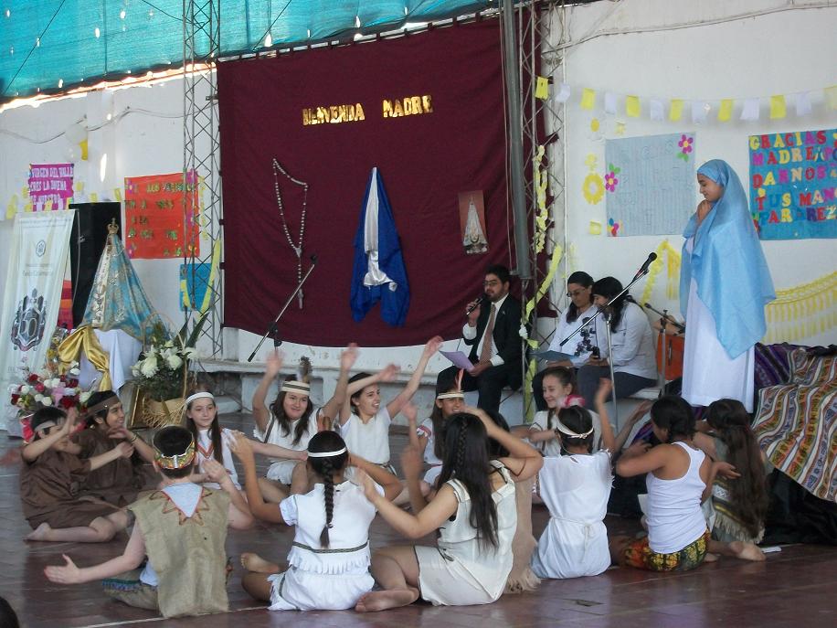 Un grupo de alumnos representó cómo la Virgen desde hace muchos años era muy querida y venerada por los indiecitos del Valle, luego llevada a la casa de Don Salazar, donde recibía cada vez más visitas de sus hijos y hasta la construcción del templo mayor, la Catedral, que alberga a todos los peregrinos que la visitan cada año.