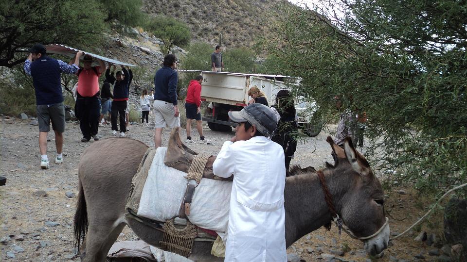 Recibidos por la directora María del Valle Córdoba emprendieron la caminata de más de una hora transportando a pie todas las cosas que trajeron para la escuela, chapas, ropa, agua mineral, gaseosas, caños, zapatillas, útiles, frazadas, artículos de limpieza, pelotas y una hermosa bandera de ceremonias que fue entregada a la directora y entre otras cosas.