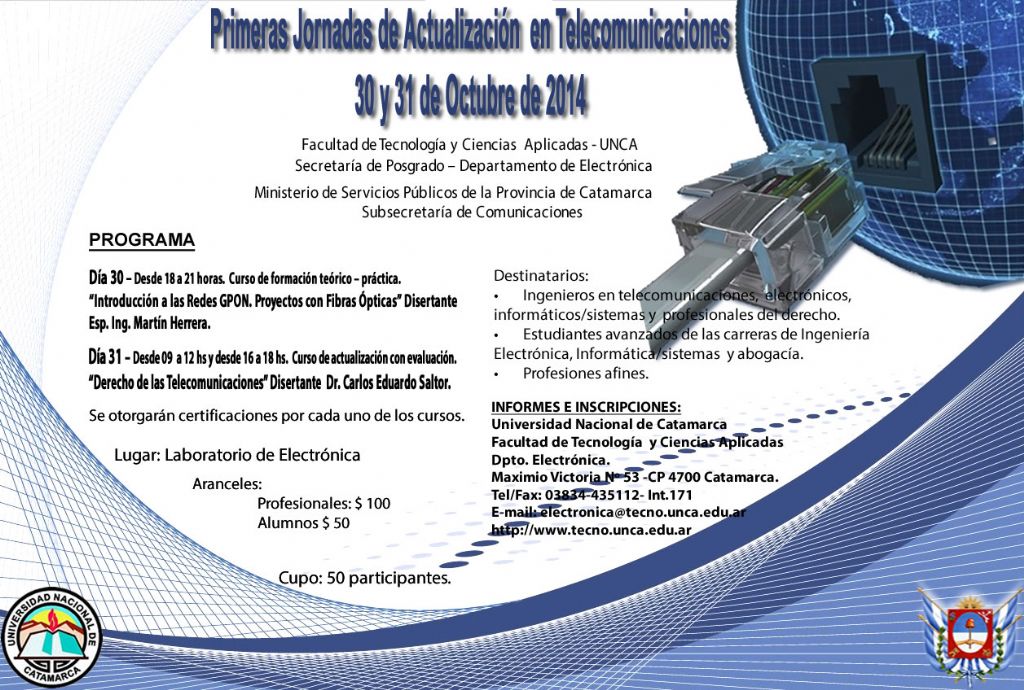 El 30 y 31 de este mes, organizado por la Facultad de Tecnología y Ciencias Aplicadas de la Universidad Nacional de Catamarca -a través del Departamento de Electrónica-, conjuntamente con la Secretaría de Comunicaciones del ministerio de Servicios Públicos de Catamarca, se concretarán las Primeras Jornadas de Actualización en Telecomunicaciones.