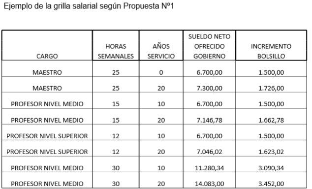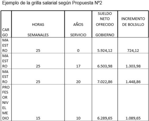 El ministerio de Educación ofreció $1.000,00 de adicional por cargo, no remunerativo, no bonificable, a partir de Febrero, según liquidación metodología FONID, e incrementar el Mínimo Paritario en $500 y el valor del punto índice en un 15% a partir de Julio del año en curso.