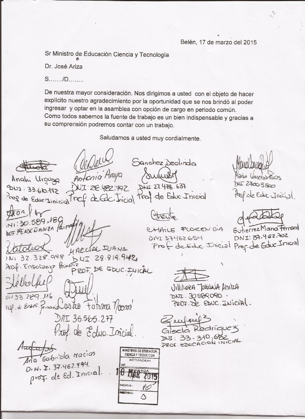 al Ministerio de Educación, Ciencia y Tecnología por la nueva disposición que