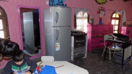 heladera con freezer, y vajilla para el refrigerio que se sirve diariamente a
