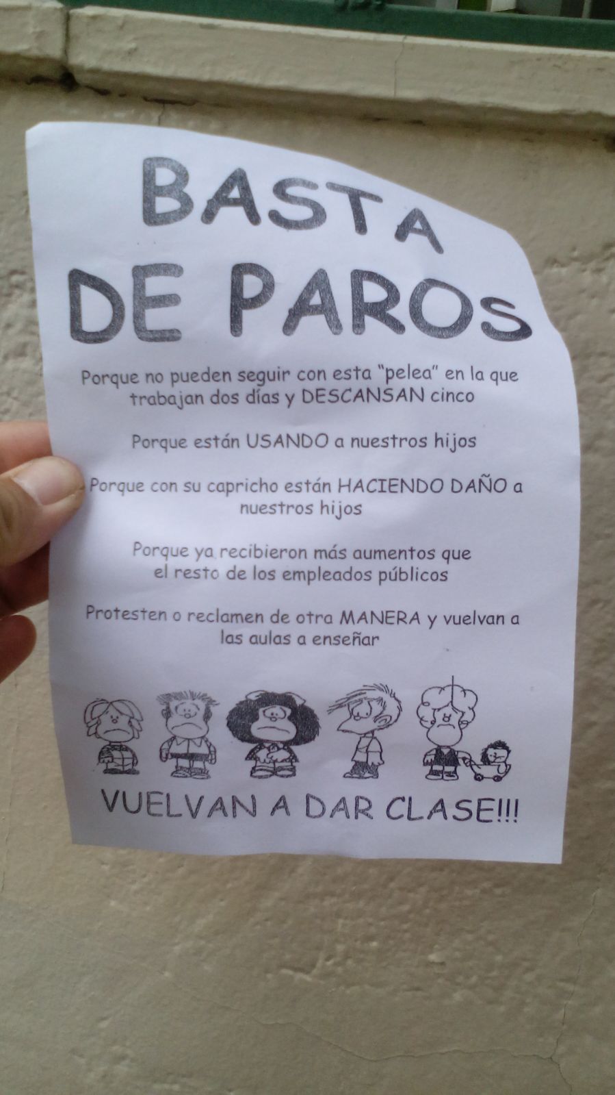 escolar- dice "Basta de paros”, a lo que agrega "porque no pueden seguir con