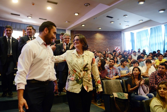 La mandataria fue recibida por el Vicegobernador (y Gobernador electo) Sergio Casas; el Rector de la Universidad Nacional de La Rioja, Fabián Calderón y el Vicerrector, José Gaspanello. También participaron del encuentro las diputadas nacionales por La Rioja, Griselda Herrera y Teresita Madera; la directora Ejecutiva del Banco Hipotecario, Ada Maza; el senador capitalino Ramón Figueroa Castellano; el subsecretario de Asuntos Institucionales, Gustavo Aguirre y funcionarios del Poder Ejecutivo de ambas provincias. El público estuvo conformado en su mayoría por estudiantes catamarqueños que asisten a la UNLAR.