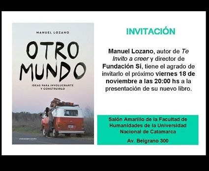 Esta noche a las 20 en el Salón Amarillo de la Facultad de Humanidades de la Universidad Nacional de Catamarca (UNCA), avenida Belgrano al 300, se llevará a cabo la presentación del libro "Otro Mundo, ideas para involucrarte y construirlo", de Manuel Lozano.