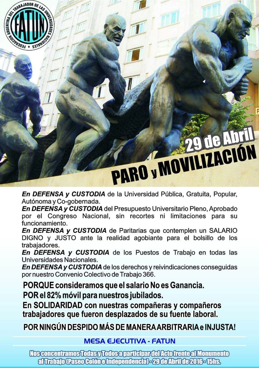 La medida de fuerza es en contra del impuesto a las ganancias, en contra de los despidos registrados en los últimos meses en todo el País, en defensa de las paritarias que contengan un salario digno y justo y del convenio colectivo de trabajo del sector, en defensa del presupuesto para las universidades públicas y gratuitas; entre otros puntos.