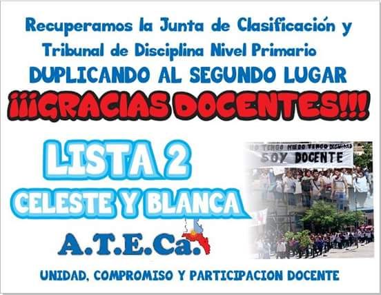 Segun informó el gremio ATECA, en el nivel primario, para la Junta Electoral ingresaron Liliana Herrera y Elena Solohaga; mientras que para el Tribunal de Disciplina ingresaron Liliana Navarro y Mabel Varga.