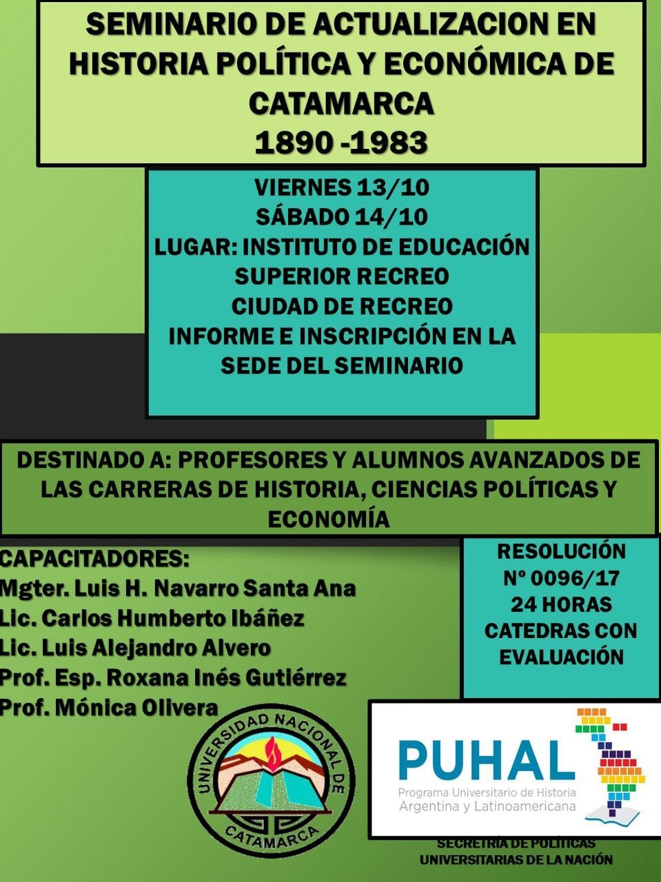 Recreo © Este viernes 13 y sábado 14 de octubre, en el local del IES Recreo, se llevará a cabo el Seminario de "Actualización Política y Económica de Catamarca" entre los años 1890 y 1983.