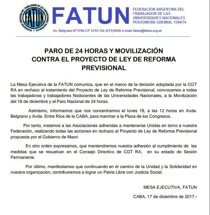 2 fotos 2 fotos lunes, 18 de diciembre de 2017 00:11 lunes, 18 de diciembre de 2017 00:11 La medida de fuerza comienza hoy a las 00 horas y se extiende durante toda la jornada del lunes. Por su parte, y hasta nuevo aviso, la obra social OSFATUN abrirá sus puertas en forma normal.