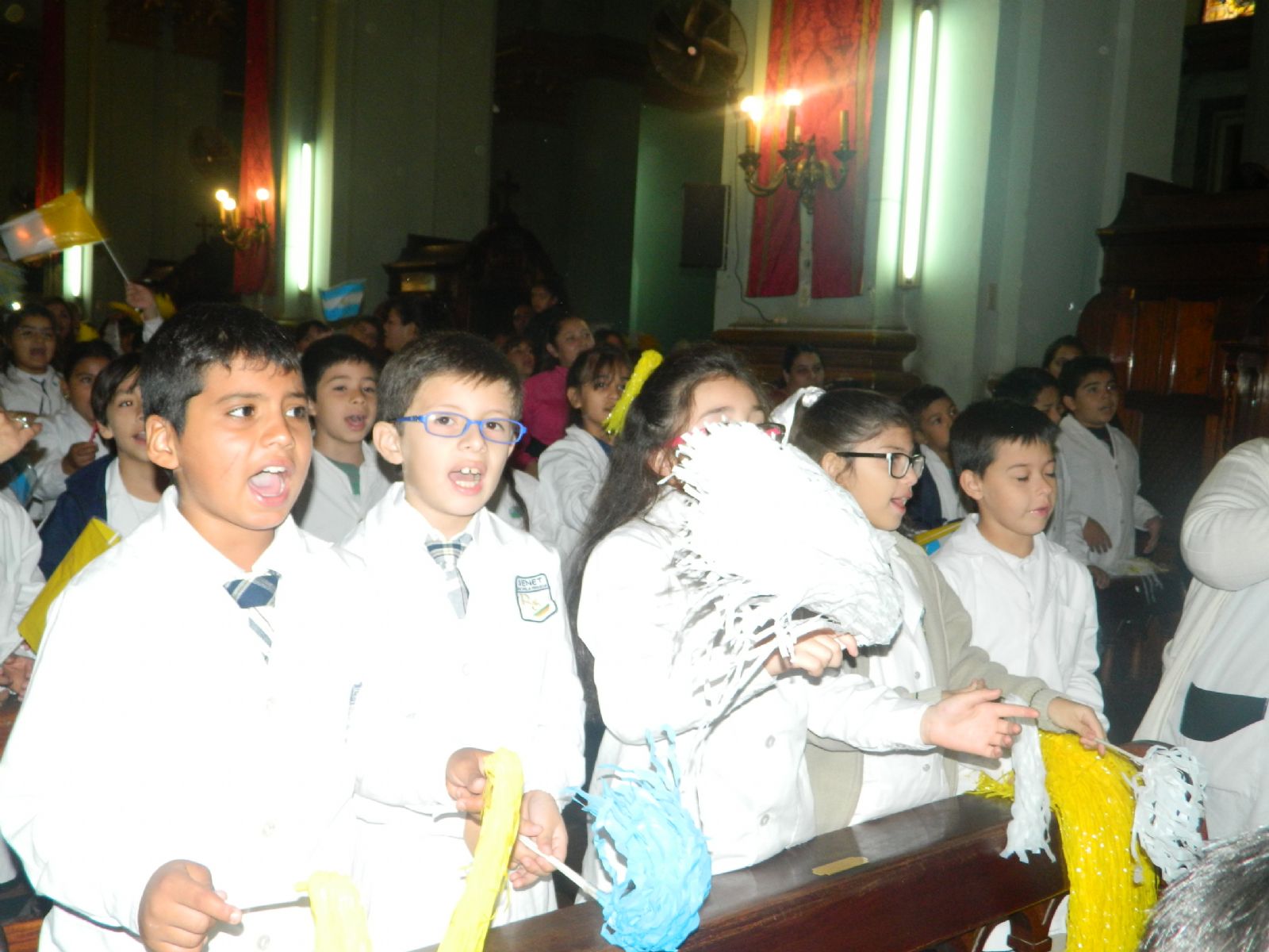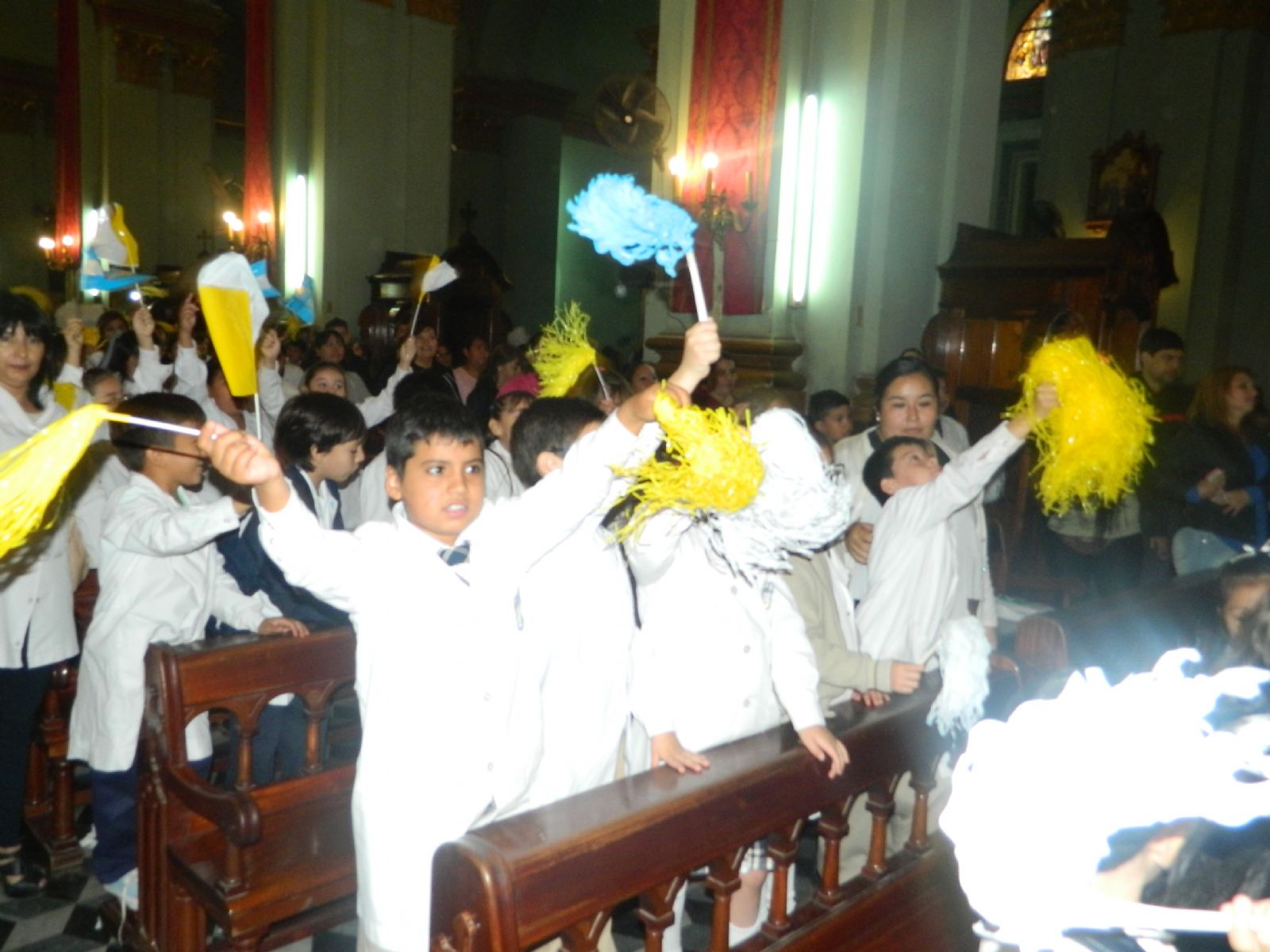su Madre, cantando con porras de colores celeste, amarillo y blanco en alto y