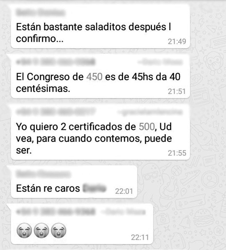 mensajes de whatsapp de supuestos docentes que pretendían comprar certificados