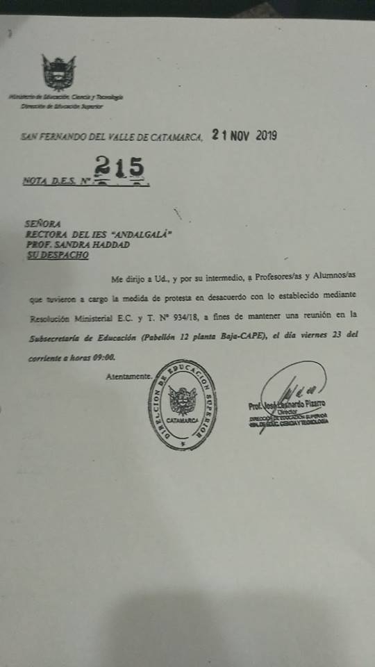 En la nota, el funcionario invita a la comunidad educativa del IES andalgalense a apersonarse al Pabellón 12, Planta baja del CAPE a las 9 de la mañana para mantener una reunión con la subsecretaria de Educación de la provincia, Olga Burella.