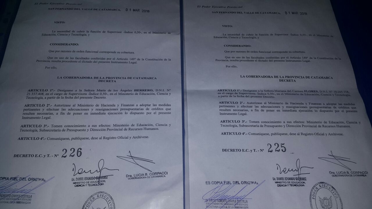 Ambas fueron designadas a través de un decreto y en ambos reza lo mismo: supervisora-índice 0,50 el cual no pertenece a un cargo jerárquico dentro del Ministerio o la carrera docente.