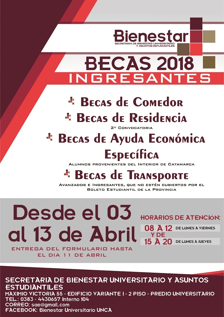 La Secretaría de Bienestar Universitario y Asuntos Estudiantiles de la UNCA comunica a los alumnos ingresantes 2018, que desde el 3 al 13 de abril estarán abiertas las inscripciones para las Becas de Comedor, Becas de Residencia 2º Convocatoria, Becas de Ayuda Económica Específica UNCA más Cerca y Becas de Transporte.