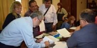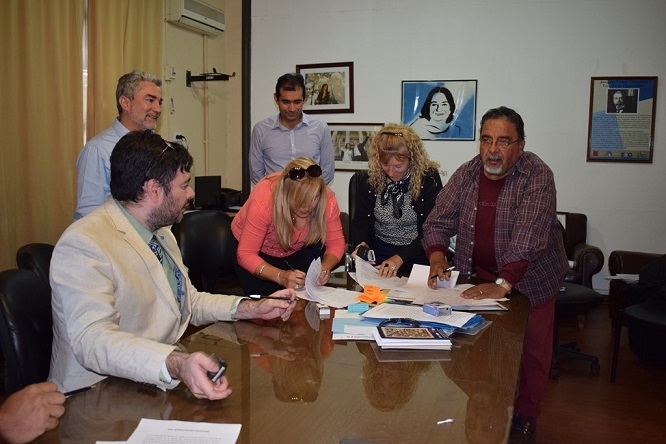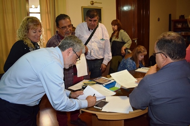 El ministro de Educación, Daniel Gutiérrez, el subsecretario de Finanzas, Ariel Luna, la subsecretaria de Gestión Educativa, Nancy Díaz y los representantes de los gremios docentes, Juan Godoy por SUTECA, Nancy Agüero por UDA, Sergio Guillamondegui por SIDCA, Silvia Bustamante por SADOP, Mario Sánchez por ATECA y Olga Ponce de León por ADUCA llegaron a un acuerdo en la paritaria docente provincial.
