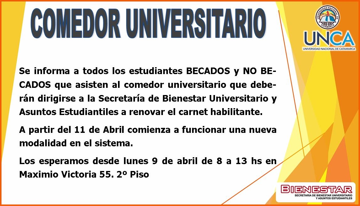 Se informa a todos los estudiantes becados y no becados que asisten al comedor universitario que deberán dirigirse a la Secretaría de Bienestar Universitario y Asuntos Estudiantiles.