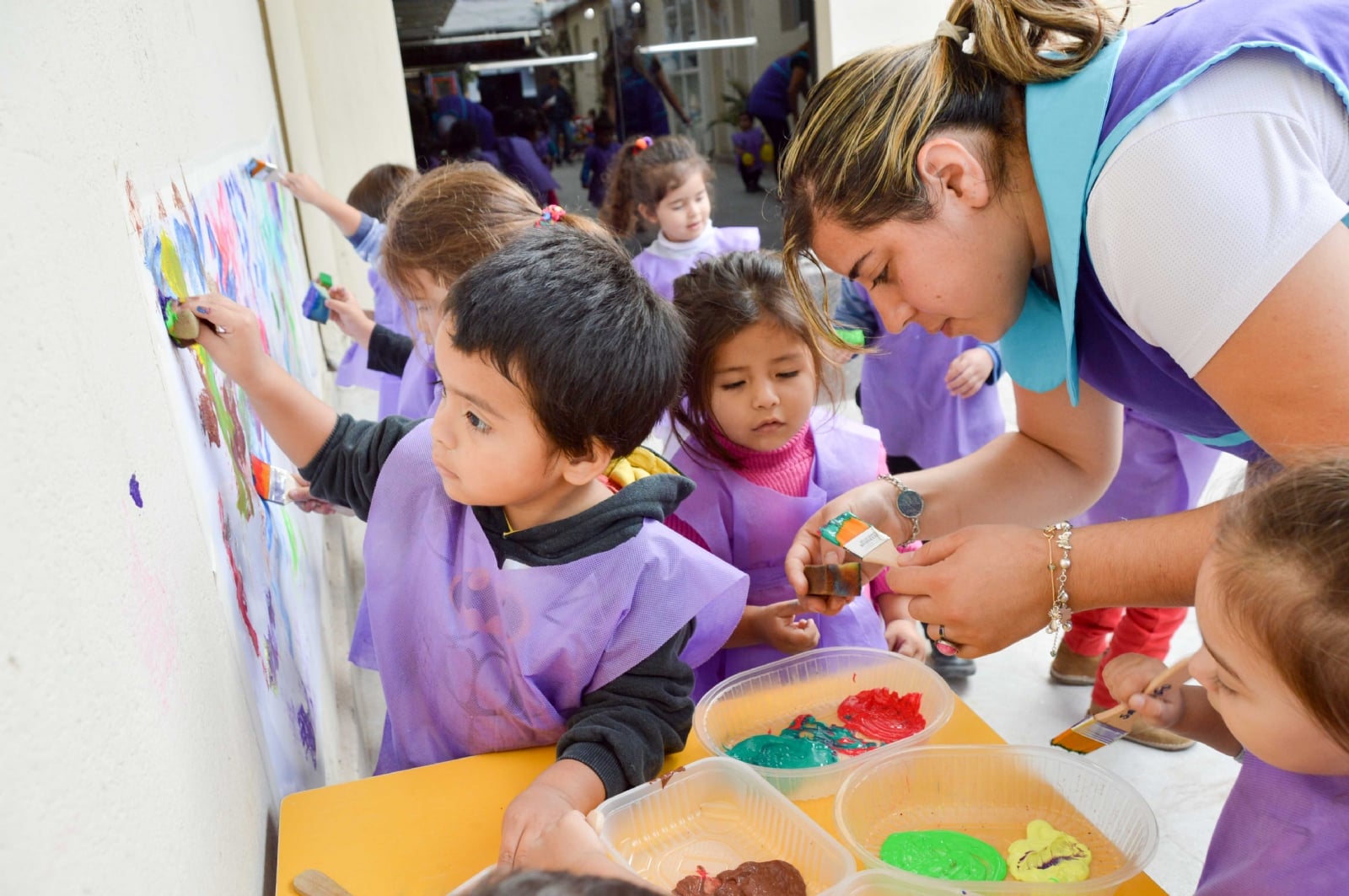 “Inculcando el arte como una manera de expresión, de comunicación y simbolizando la creatividad a partir de objetos básicos y fáciles de usar”, los chicos pusieron manos a la obra para crear estos murales, llenos de alegría y diversión, según explico la directora del Jardín, Jimena Barros.