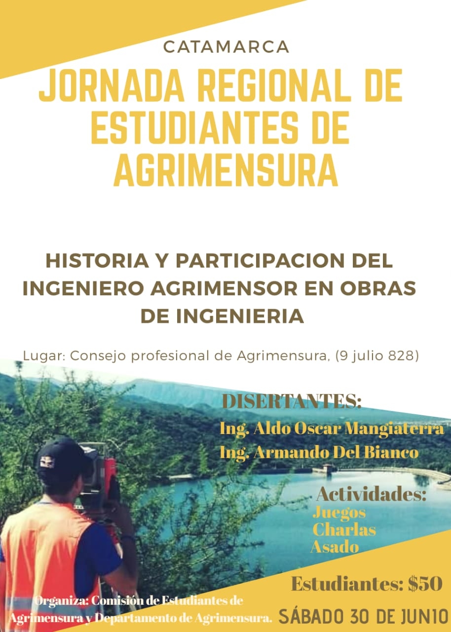 Con el lema “Historia y participación del Ingeniero Agrimensor en obras de ingeniería”, el 30 de este mes tendrá lugar en el salón de eventos del Consejo Profesional de Agrimensura de Catamarca, 9 de Julio 828 de San Fernando del Valle de Catamarca, la Jornada Regional de Estudiantes de Agrimensura.