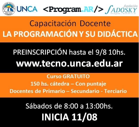 La preinscripción se realiza a través de la página www.tecno.unca.edu.ar y estará abierta hasta el 9 de agosto, a las 10. Mientras que el 10 de agosto se comunicará, mediante correo electrónico, a los docentes seleccionados.