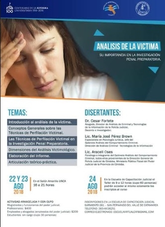 En el marco de acuerdos interinstitucionales y por espacio de tres días, dará inicio mañana por la tarde en el Salón Amarillo de la UNCa, la capacitación dirigida a integrantes del Poder Judicial, Abogados del foro y Estudiantes, en la que desarrollarán conocimientos generales sobre el alcance y aplicación teórico-metodológica de las técnicas de perfilación victimal.